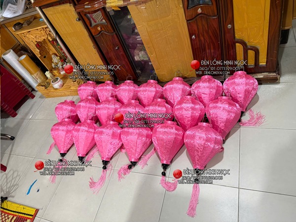 Lồng đèn giả gấm màu hồng cho khách trang trí lễ cưới để ngoài trời, màu hồng nhẹ nhàng tạo nét riêng theo yêu cầu cô dâu, chú rễ.