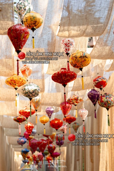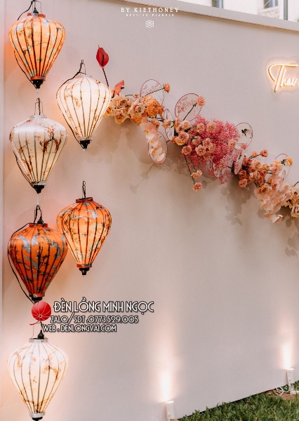Lồng đèn phi hoa trang trí đám cưới, Ngoài lồng đèn lụa truyền thống Hội An thì lồng đèn phi hoa 3D cũng có thể được sử dụng trang trí đám cưới thêm phần mới lạ, lựa chọn những họa tiết hoa lá chim chóc ý nghĩa, kết hợp trang trí nhiều màu sắc, tạo nên một không gian lung linh trong đám cưới.